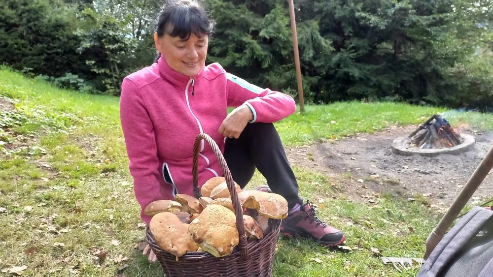 Po skvělém hodování a na sluníčku a s nádherným výhledem na hory zorganizoval Víťa vysokohorský kuželkářský turnaj. Když nás všechny s přehledem porazil, popřál nám pak šťastnou cestu dolů na Ostravici na vlak. Jako dárek každý dostal spoustu hřibů na cestu.