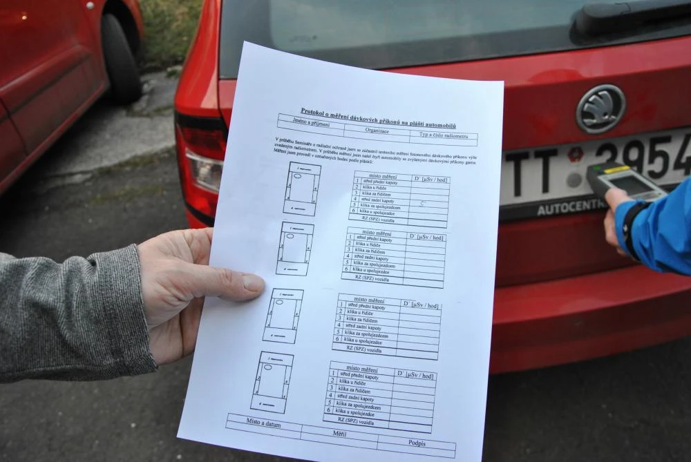Před zahájením každý účastník obdržel svůj vlastní protokol o měření dávkových příkonů na plášti automobilů, který obsahoval plánek s označenými 6 body, do kterých měli zanést měření.