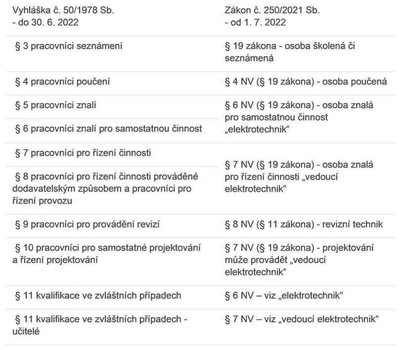 Mění se rozdělení odborné způsobilosti v elektrotechnice a dnem 1. 7. 2022 nabyl účinnosti zákon č. 250/2021 Sb., o bezpečnosti práce v souvislosti s provozem vyhrazených technických zařízení a o změně souvisejících zákonů a příslušná prováděcí nařízení vlády, která mimo jiné nahrazují vyhlášku č. 50/1978 Sb., o odborné způsobilosti v elektrotechnice a vyhlášku č. 73/2010 Sb., o stanovení vyhrazených elektrických technických zařízení.
