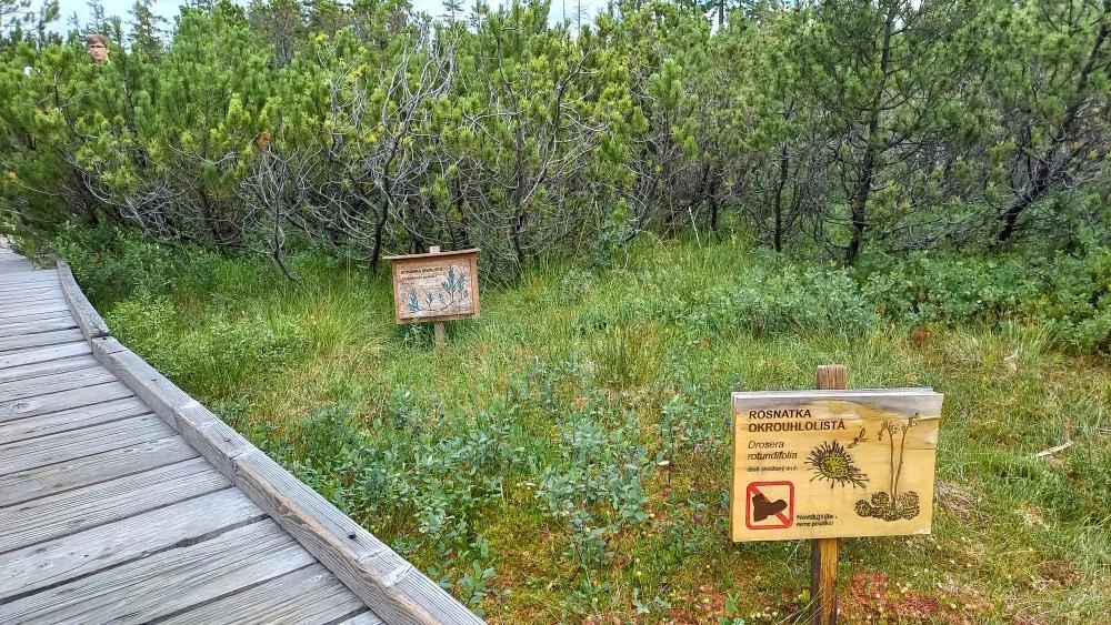 V plánu byla i návštěva Tříjezerní slatě. Rovněž jeden z mimořádných zážitků. Bylo tam sice trochu více lidí, ale procházka dřevěným chodníkem po rašeliništi stále stojí zato. Ani nevím, proč se mi vybavila po přečtení informační cedule, že hloubka je 2 – 4 m, známá scéna s Janem Werichem v roli císaře, jak se topí. Ho zachránila babka, která mu „přičarovala“ dno. Koukám kolem sebe – babka nikde. Bezmezně věřím stavitelům dřevěného chodníku a čtu si po cestě názvy různých vyrostlých travin. Přistihuji se, jak věnuji nemalou pozornost dřevěné podlaze. Jsem už více pamatující, a v hlavě mi defiluje, kolik jsem viděl na své chatě zchátralého dřeva. A lakovaného. Barvou natřeného.