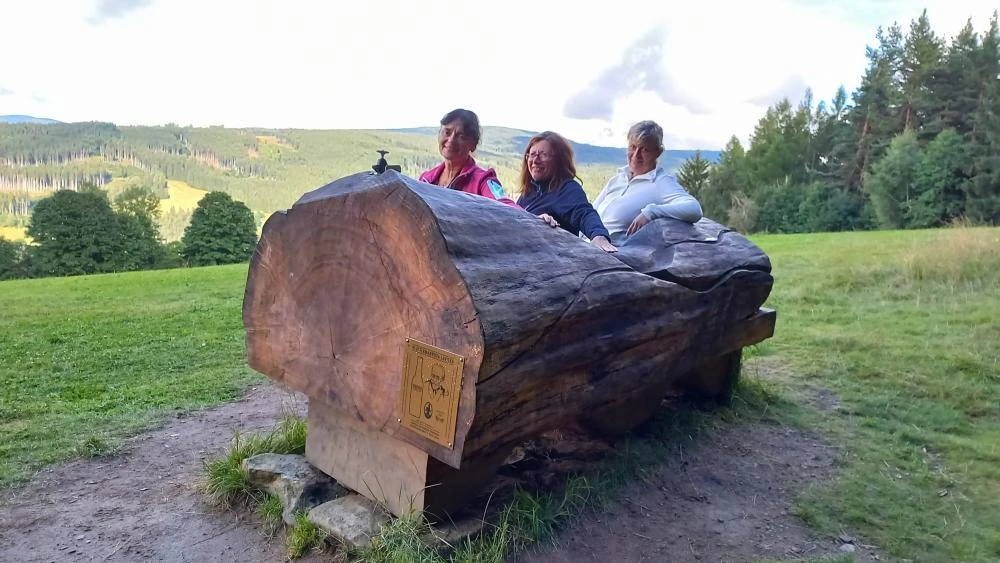 Týden na počátku srpna nám přál i s počasím, žádné tropy, ani mráz, jen sem tam malý deštík. Pohoda. Jak mají Krkonoše svého Krakonoše, tak má Šumava Klostermanna. A tak jsme na výletech naráželi na Klostrmannovu lavičku, Klostermannovu stezku, Klostermannův most, chatu, vyhlídku aj. Proto se nikdo z rodiny ani známých nemohli divit, že jsme po dovolené předávali Klostermannovu pozornost (viz obr.).